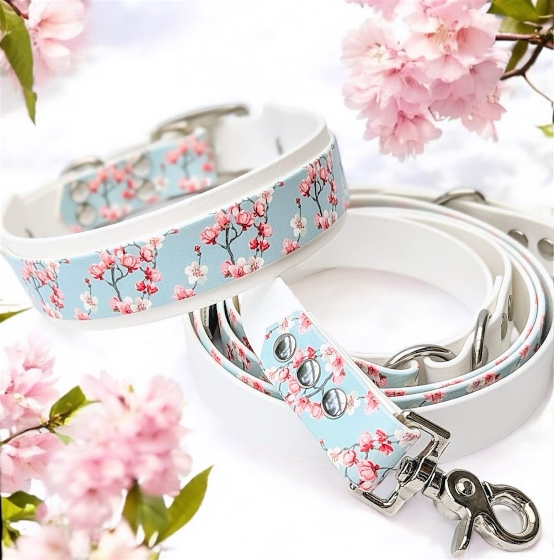 Découvrez notre collier CHERRY FLOWER en Biothane imprimé inspiré inspiré par la beauté des fleurs de Sakura en version simple ou doublé.