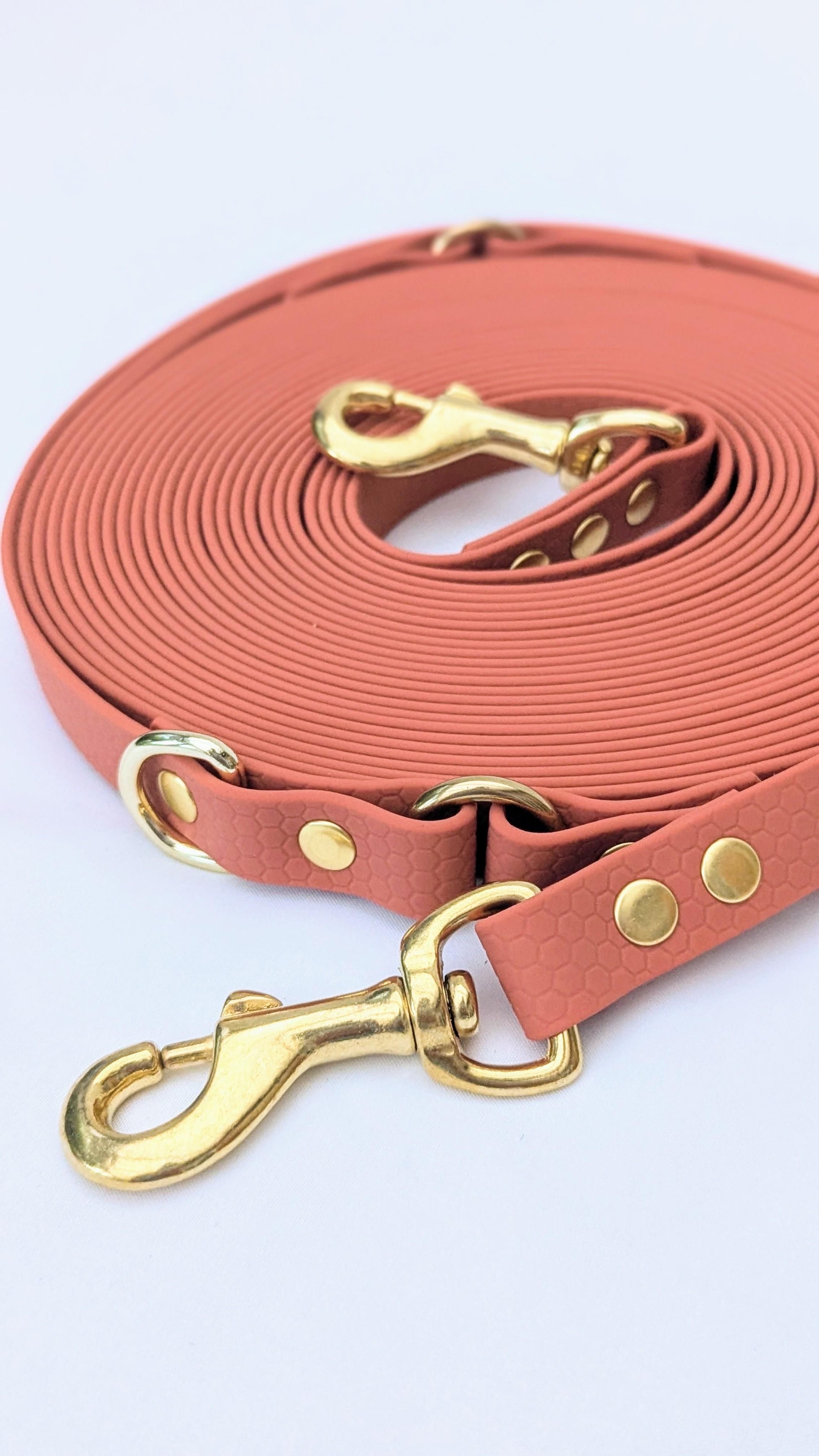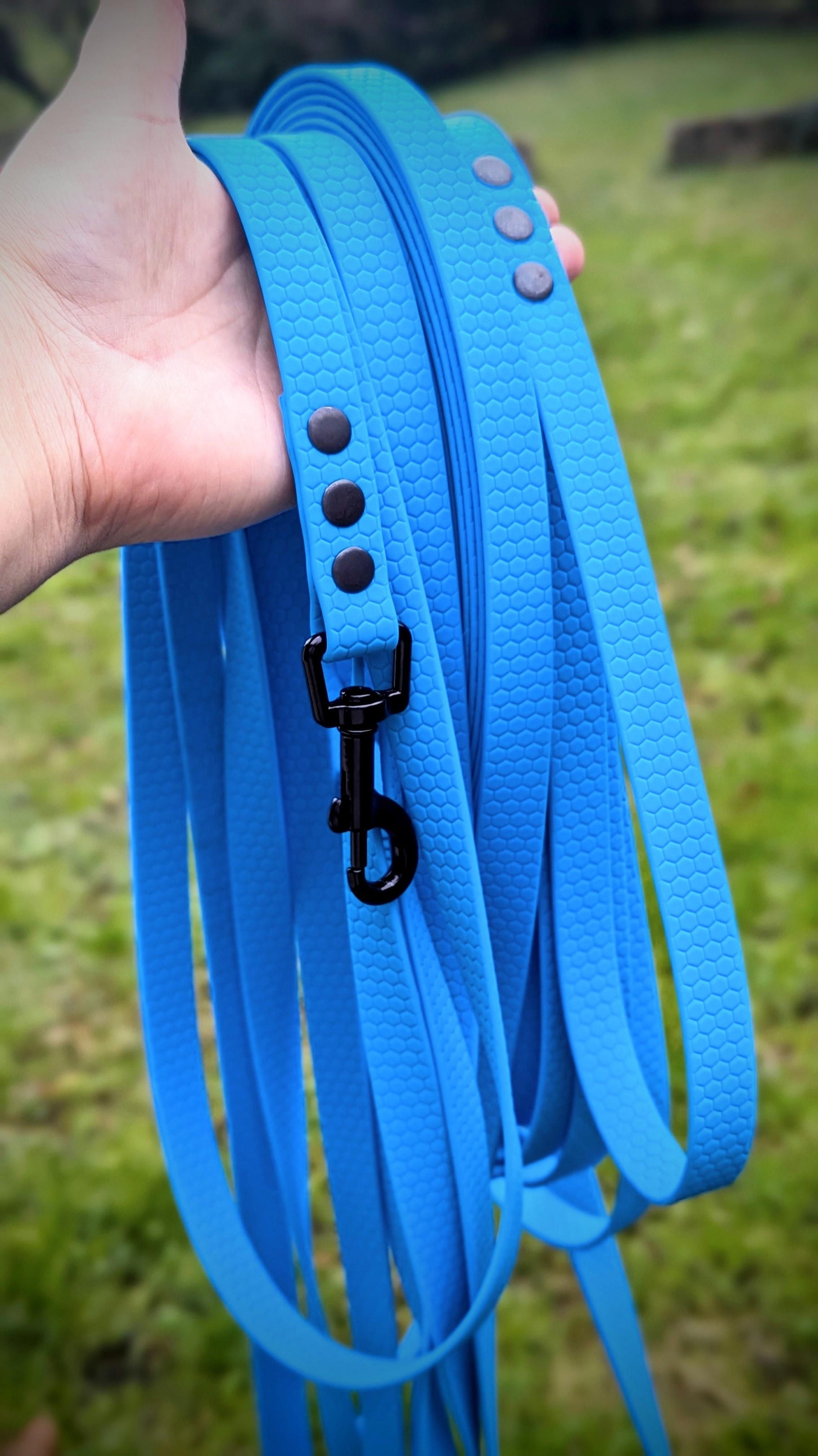 Faite en sangle HEXA (une sangle enduite en PVC) et assemblée à la main, cette longe est légère, résistante et facile à nettoyer !
